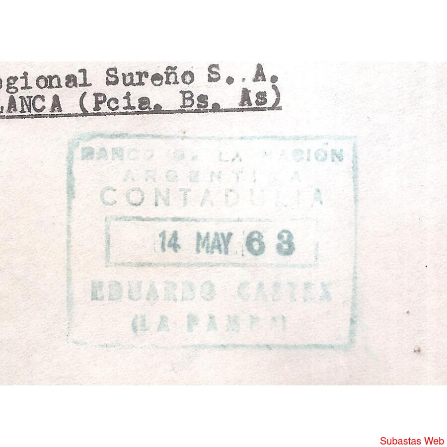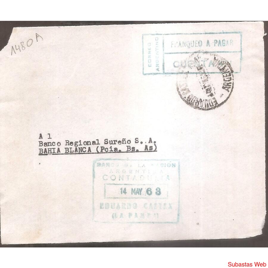 FRENTE DE SOBRE CIRCULADO EL 14 DE MAYO DE 1963 DE EDUARDO CASTEX, LA PAMPA - A BAHIA BLANCA- , FRANQUEO A PAGAR . MATASELLO DE EDUARDO CASTEX HAY OTRO SELLO DE CONTADURIA DEL BANCO NACION NO HAY DORSO