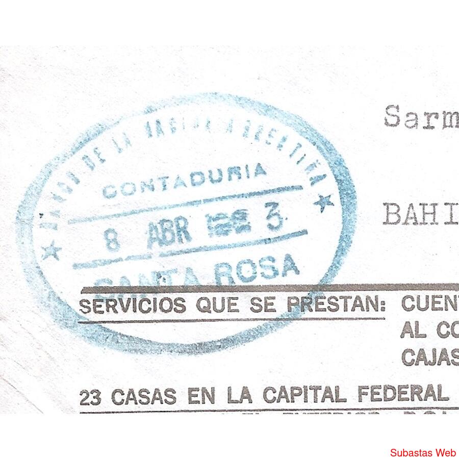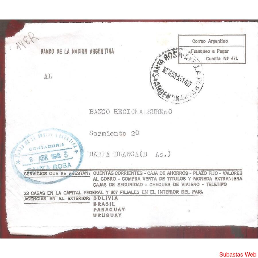 FRENTE DE SOBRE CIRCULADO EL 9 DE ABRIL DE 1963 DESANTA ROSA, LA PAMPA - A BAHIA BLANCA- , FRANQUEO A PAGAR . MATASELLO DE SANTA ROSA HAY OTRO SELLO DE CONTADURIA DEL BANCO NACION NO HAY DORSO