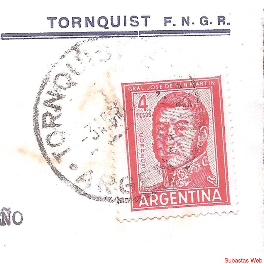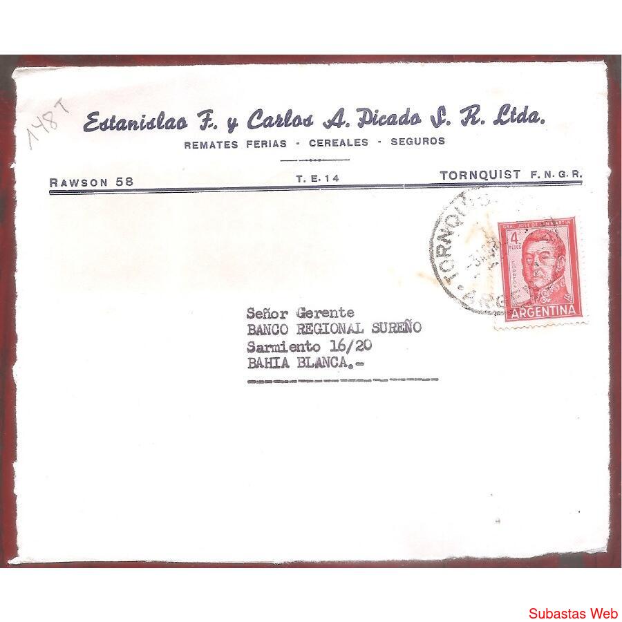 FRENTE DE SOBRE CIRCULADO EL 3 DE ABRIL DE 1963 DE TORNSQUIST, BUENOS AIRES - A BAHIA BLANCA- , FRANQUEO: PROCERES Y RIQUEZAS: SAN MARTIN DE $4 . MATASELLO DE TORNQUIST, SOBRE MEMBRETADO DE ESTANISLAO Y CARLOS PICADO SRL NO HAY DORSO