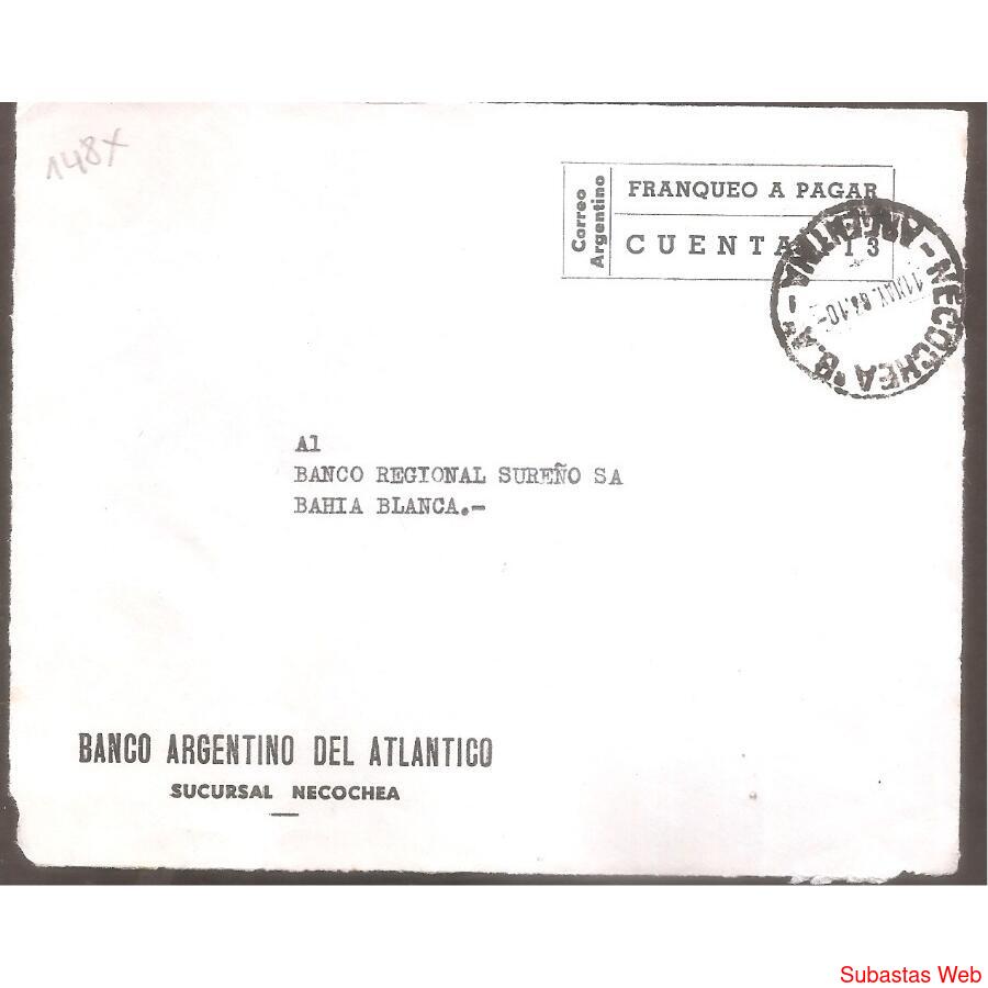 FRENTE DE SOBRE CIRCULADO EL 11 DE MAYO DE 1963 DE NECOCHEA, BUENOS AIRES - A BAHIA BLANCA- , FRANQUEO: A PAGAR MATASELLO DE NECOCHEA, NO HAY DORSO, SOBRE MEMBRETADO: BANCO ARGENTINO DEL ATLANTICO